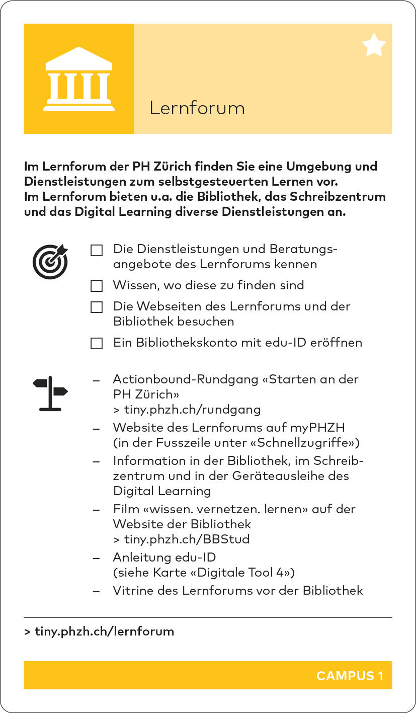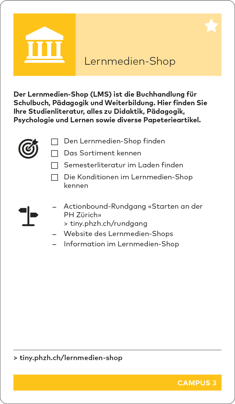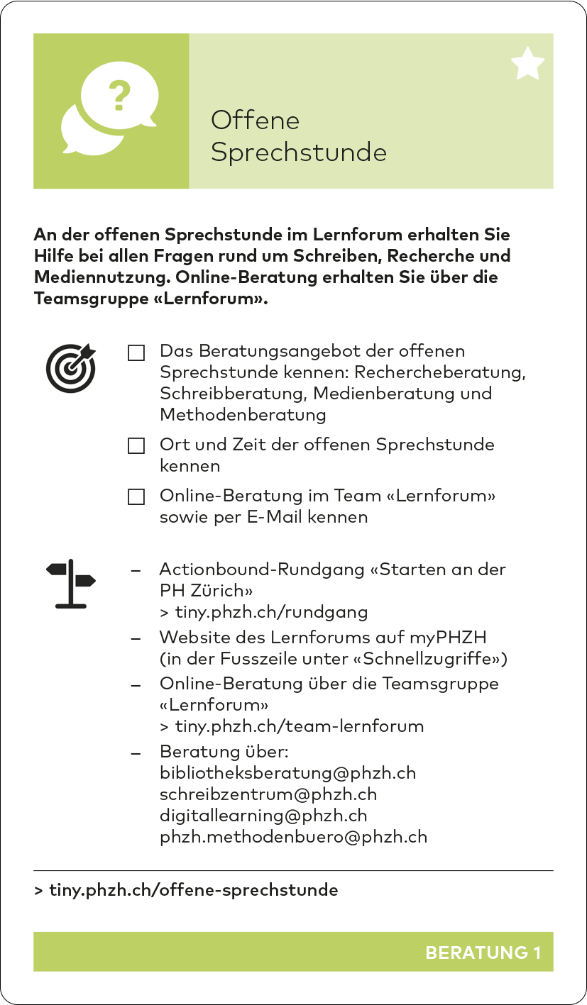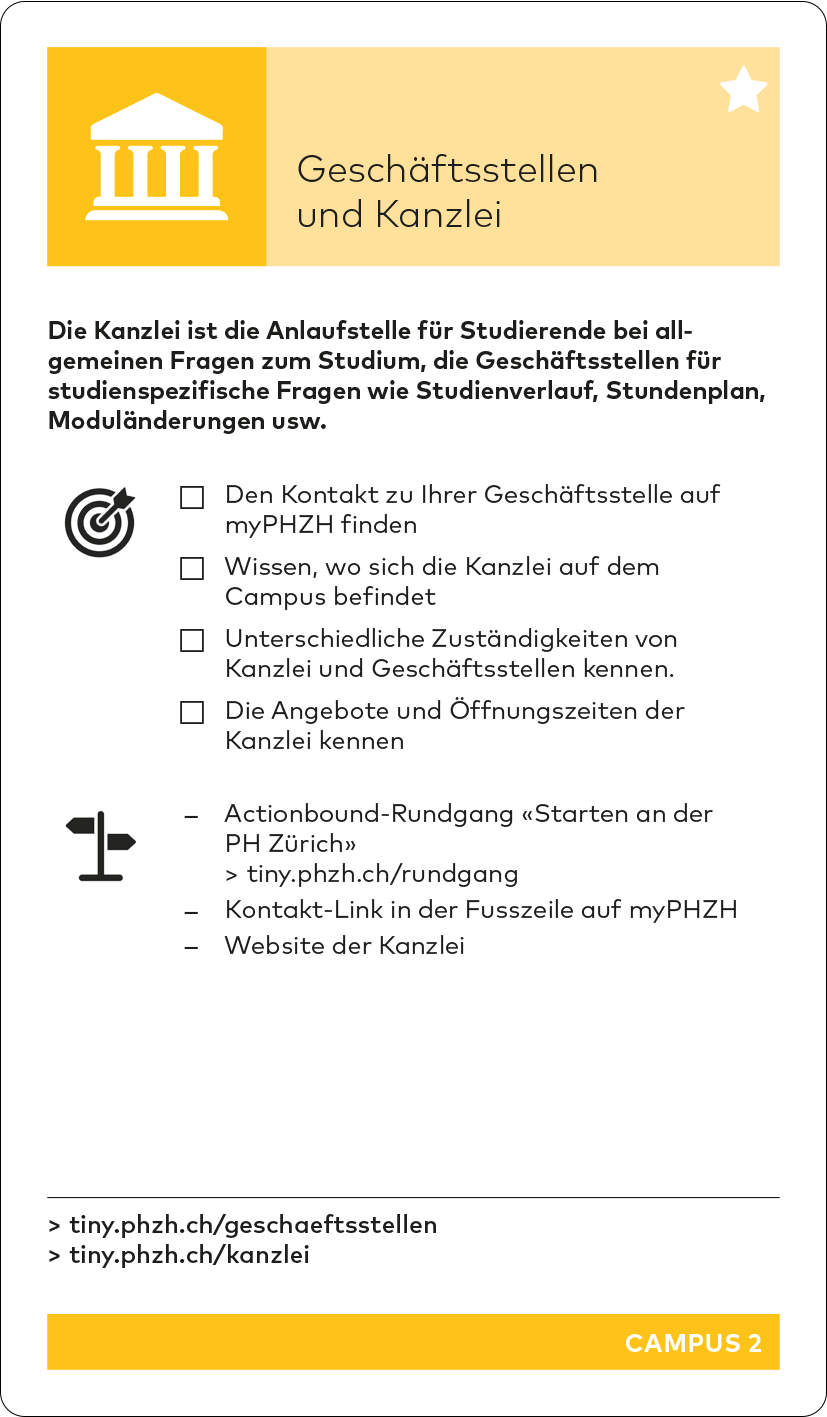 Auf den Karten CAMPUS 1-6 sowie auf BERATUNG 1: Offene Sprechstunde wird der Actionbound-Rundgang «Starten an der PHZH» erwähnt.