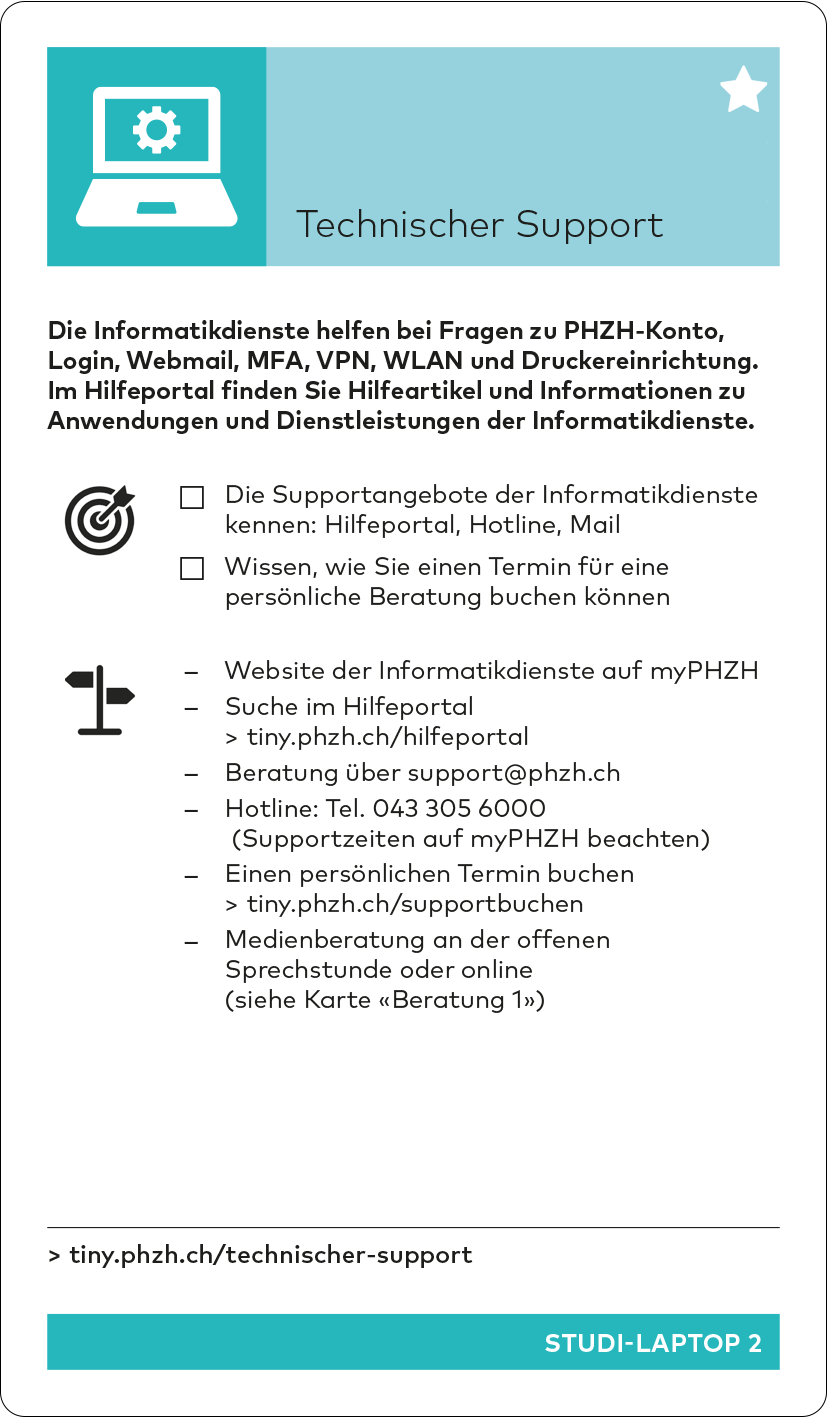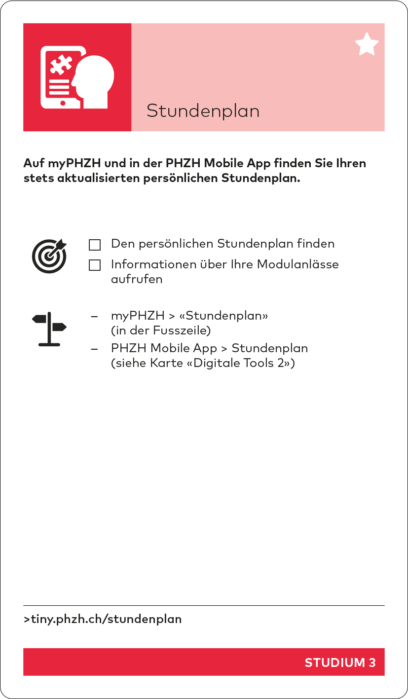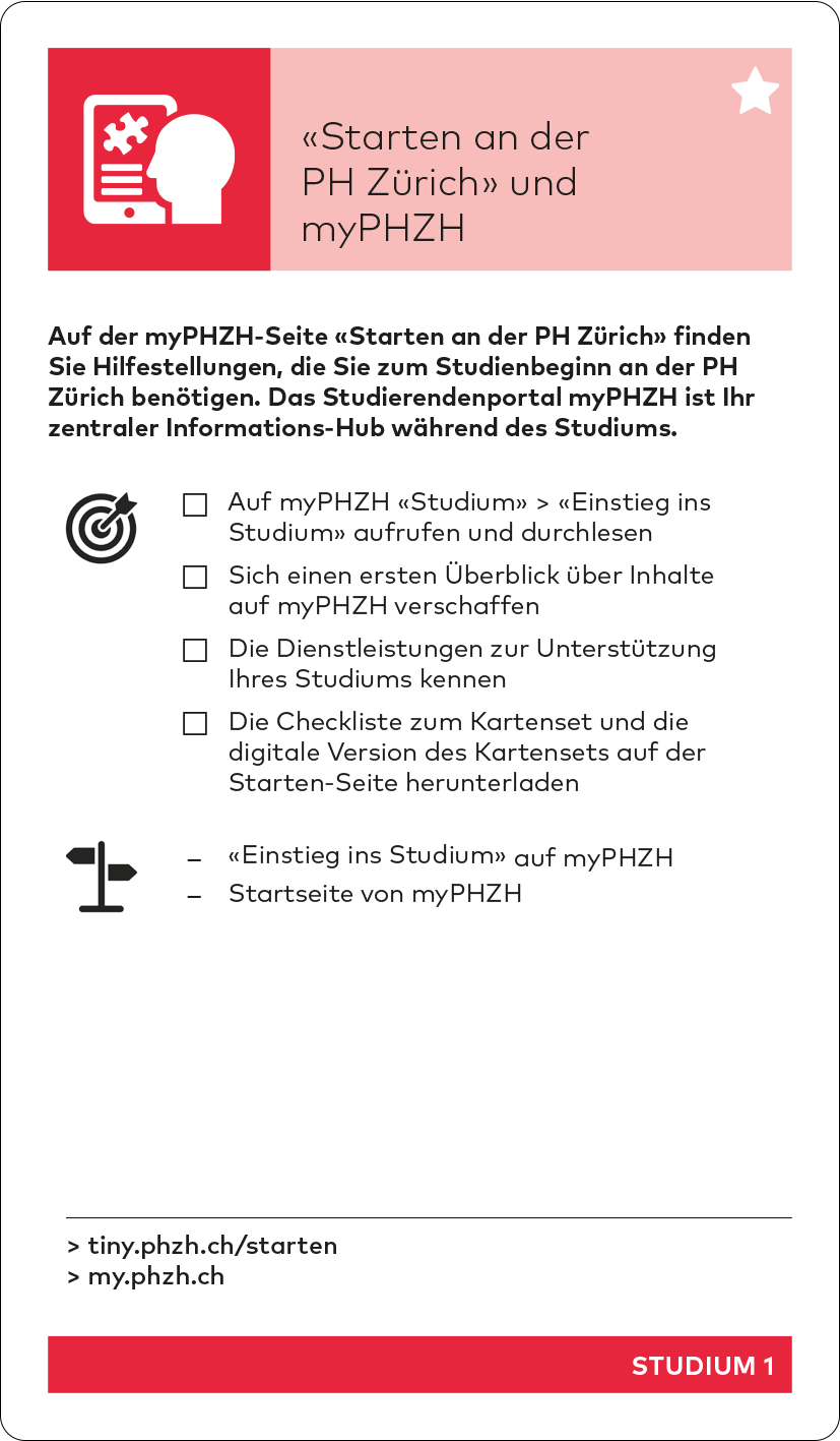 Im Verlauf des Herbstsemesters wird das Studiweb durch das neue Studierendenportal «myPHZH» mit einem anderen Aufbau ersetzt. Die Inhalte bleiben aber bestehen und die Tinylinks werden aktualisiert. Die aktualisierte Version des Kartensets kann dann auf der Starten-Seite unter «Einstieg ins Studium» heruntergeladen werden.