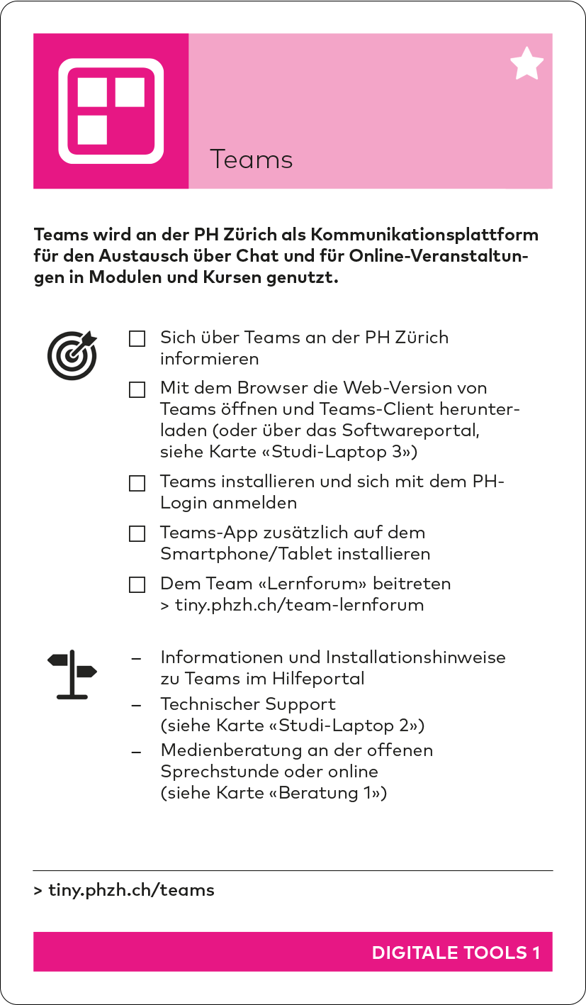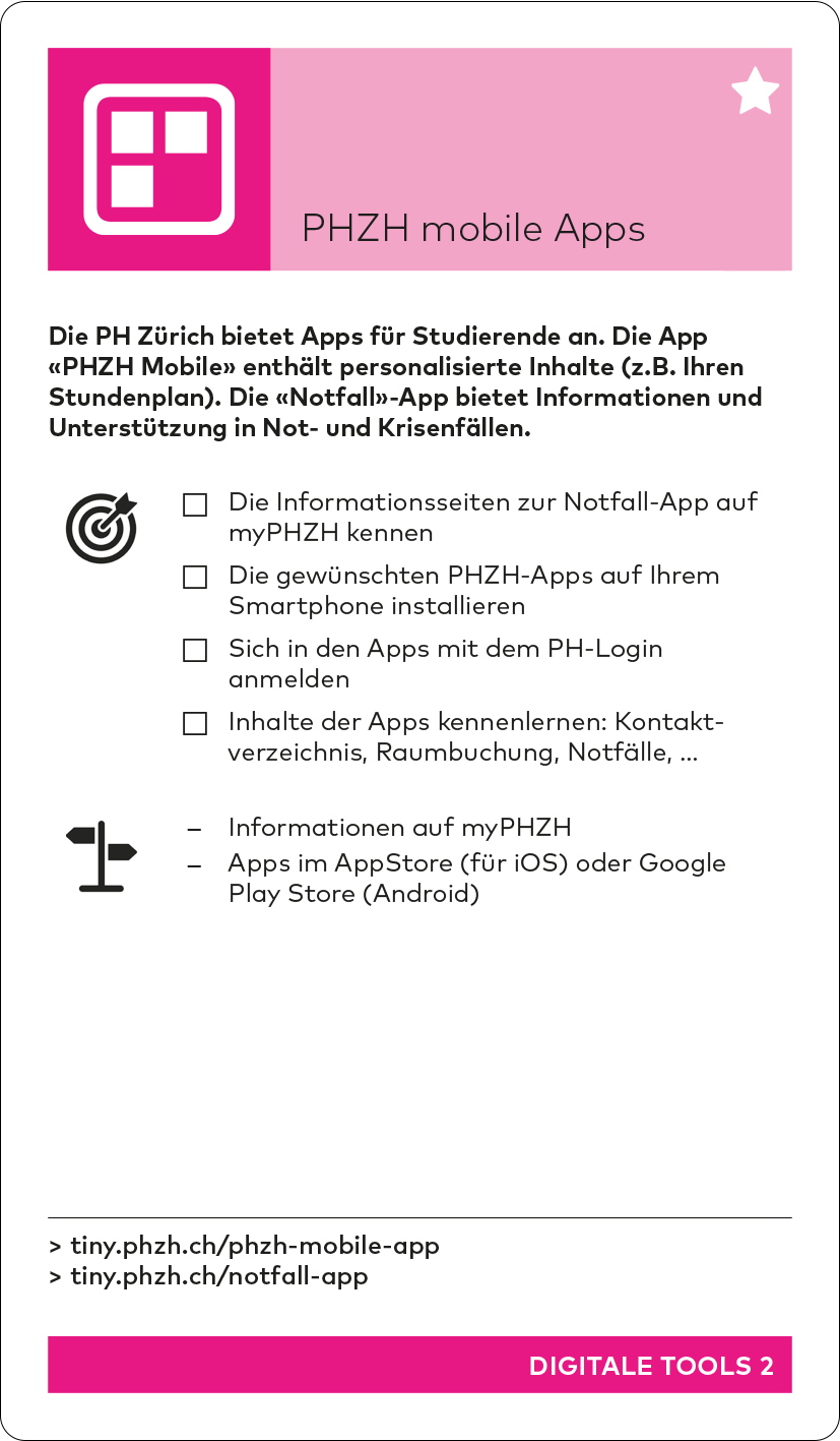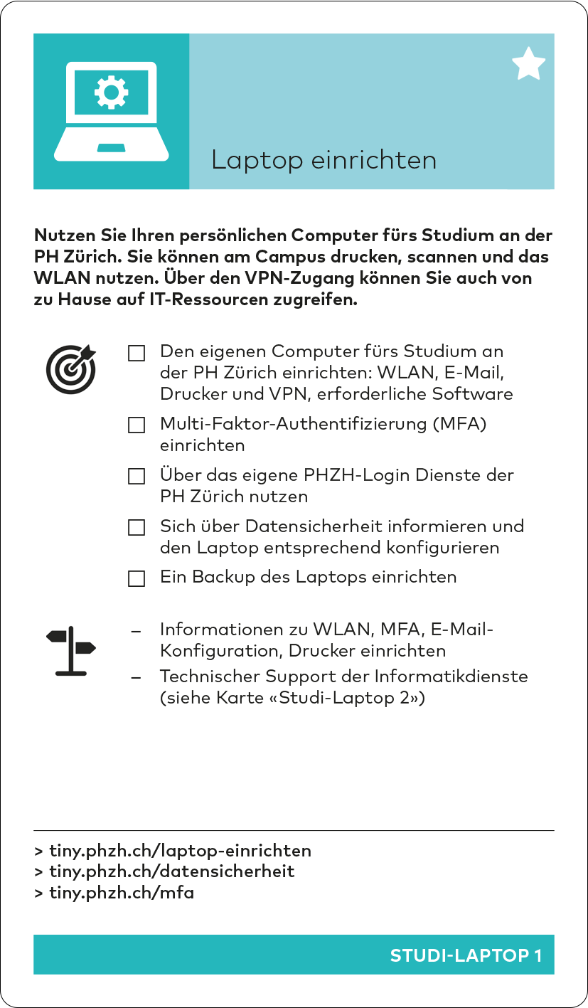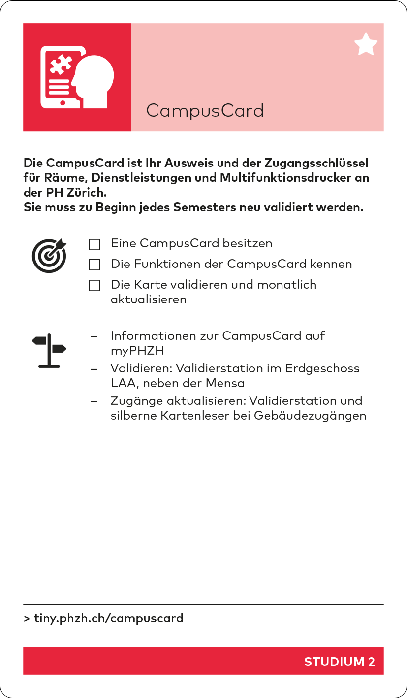 Im Verlauf des Herbstsemesters wird das Studiweb durch das neue Studierendenportal «myPHZH» mit einem anderen Aufbau ersetzt. Die Inhalte bleiben aber bestehen und die Tinylinks werden aktualisiert. Die aktualisierte Version des Kartensets kann dann auf der Starten-Seite unter «Einstieg ins Studium» heruntergeladen werden.