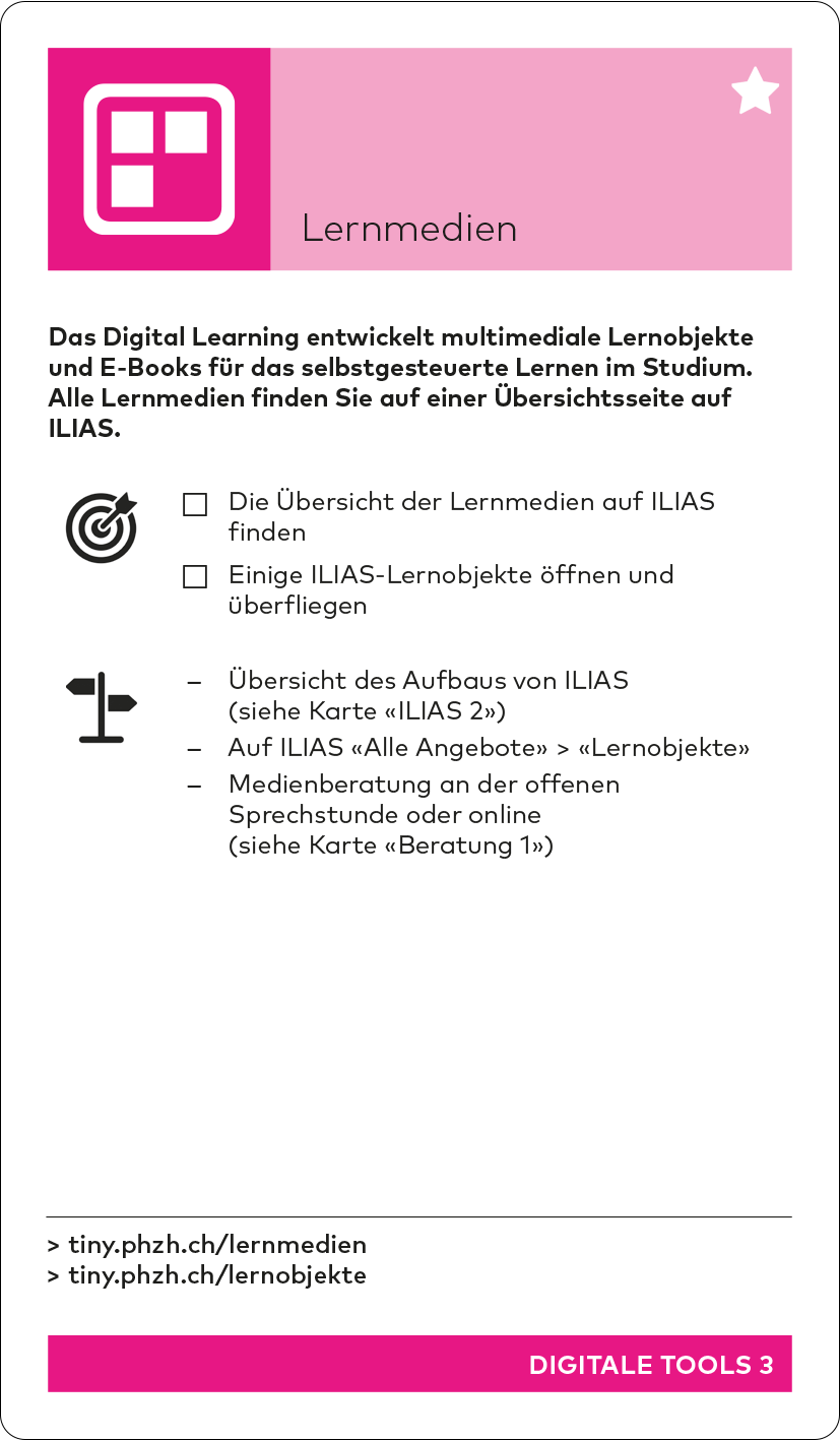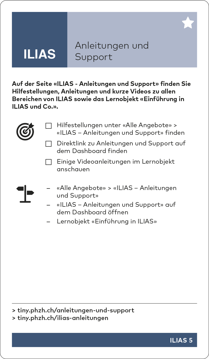 - Starten-Seite mit PDF-Downloads von Checkliste, Kartenset, ILIAS-Übersichtsblatt «Kurzanleitung ILIAS» und Links zu Anleitungen Starten-Seite im Studiweb