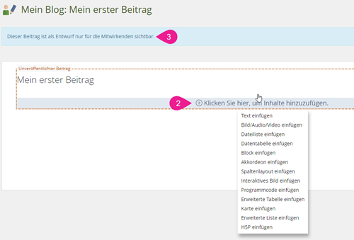 ILIAS-Blogs in ILIAS-Kursen kann man zusätzliche Autorinnen und Autoren hinzufügen: