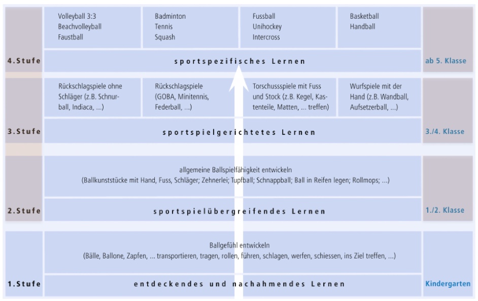 Abbildung 1 zeigt einen fähigkeitsorientierten Aufbau der Spielfähigkeit in der Primarstufe bis zur Kompetenz. Klicken Sie in die rot markierten Felder, um direkt zu den entsprechenden Stufen zu kommen.