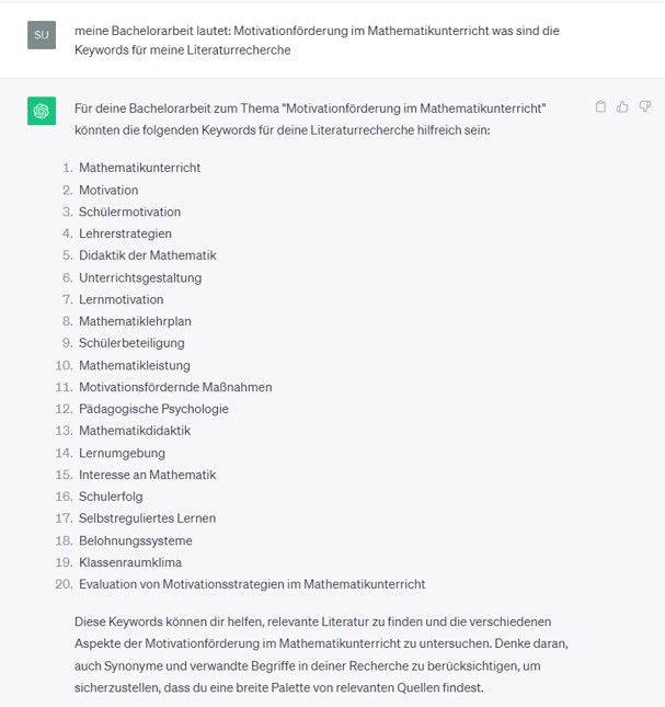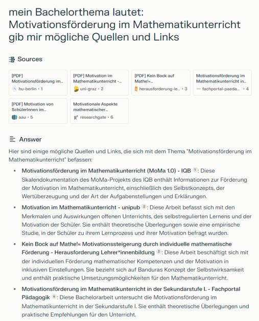 - Ideal als Inspiration für mögliche Quellen, zur Ideenfindung hingegen etwas schlechter geeignet als ChatGPT.
