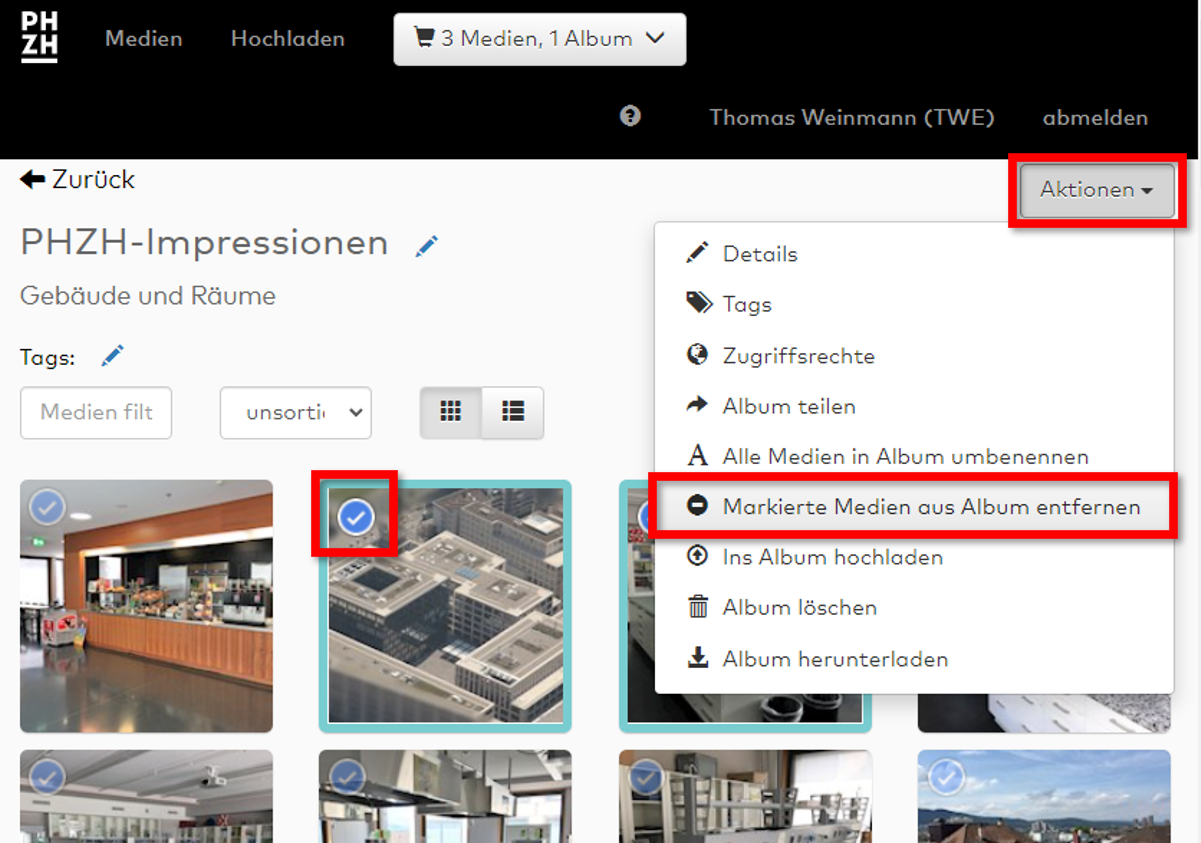 - Öffnen Sie das Menü «Aktionen» oben rechts und wählen Sie «Markierte Medien aus Album entfernen»