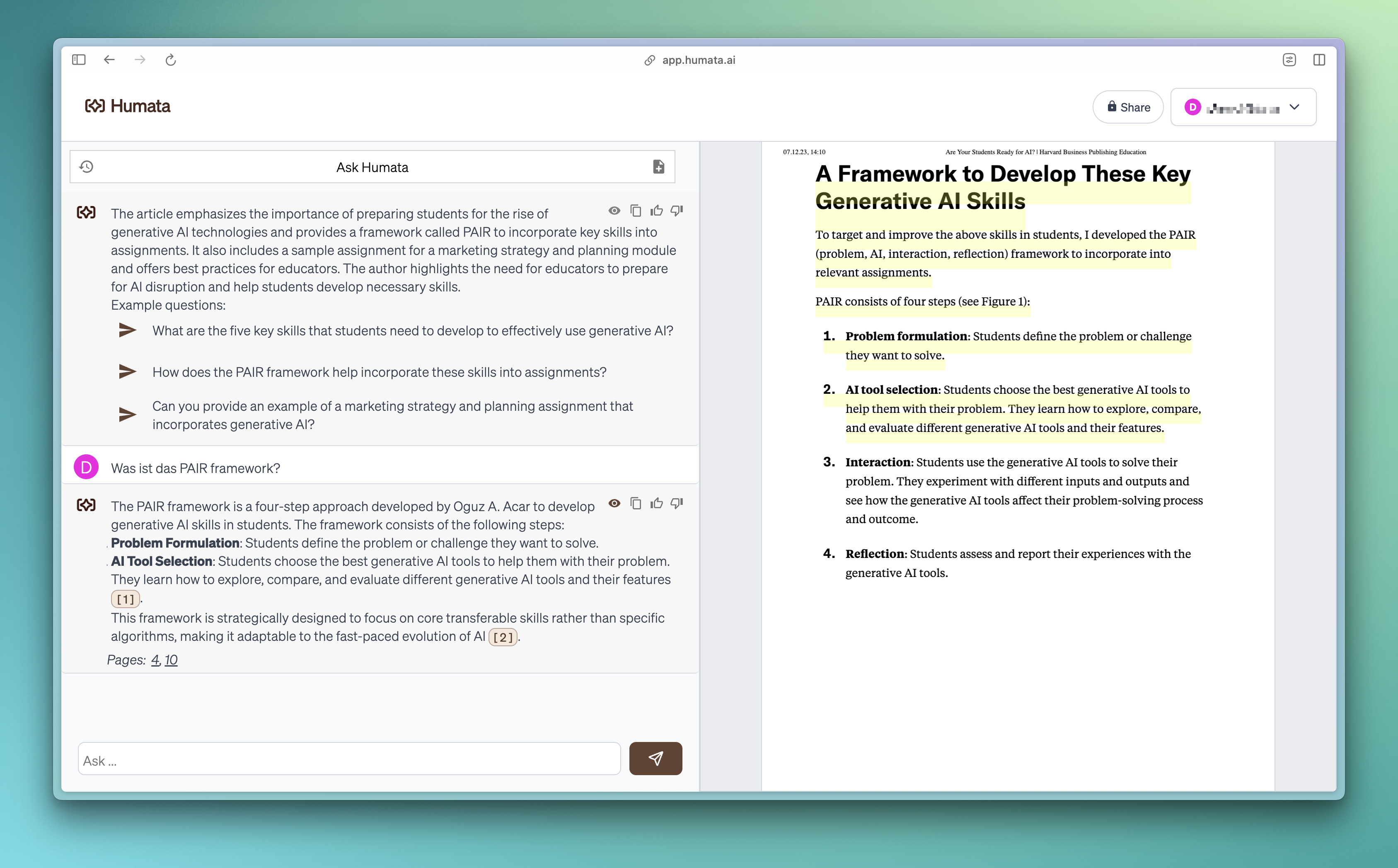 - Die Textstelle, auf die sich Humata in der Antwort bezieht, wird markiert (meist etwas zu grosszügig, aber trotzdem hilfreich).
