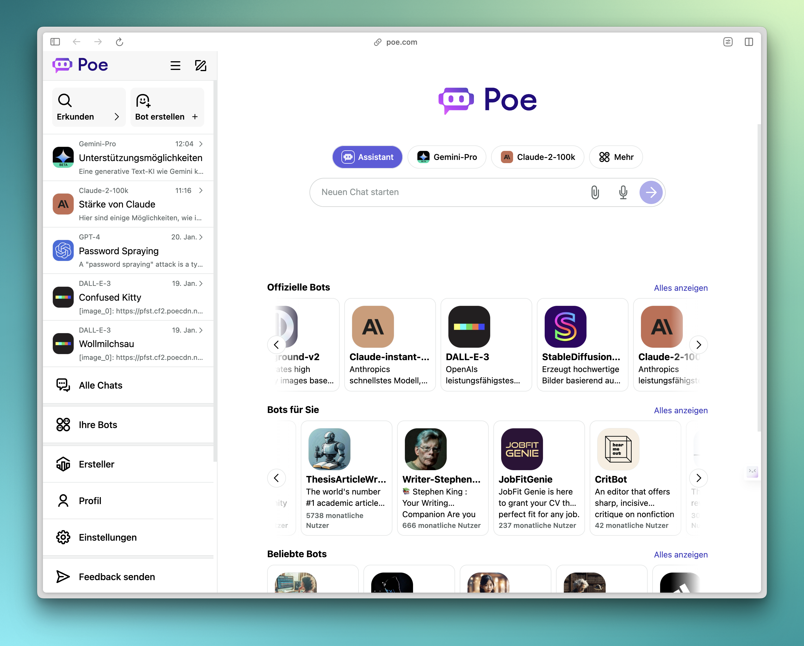 Poe ist eine KI-Meta-App, die einen Login erfordert. Mit Poe kann man die meisten Textgeneratoren in unterschiedlichen Versionen und einige Bildgeneratoren wie DALL-E und Stable Diffusion nutzen. Auch KI-Modelle mit Geobeschränkungen (wie Claude) können damit genutzt werden. Viele Modelle sind kostenlos nutzbar, die aktuellsten sind kostenlos nur eingeschränkt verfügbar. Um diese freizuschalten, ist ein Abo erforderlich (ca. 20.– Fr./Monat).