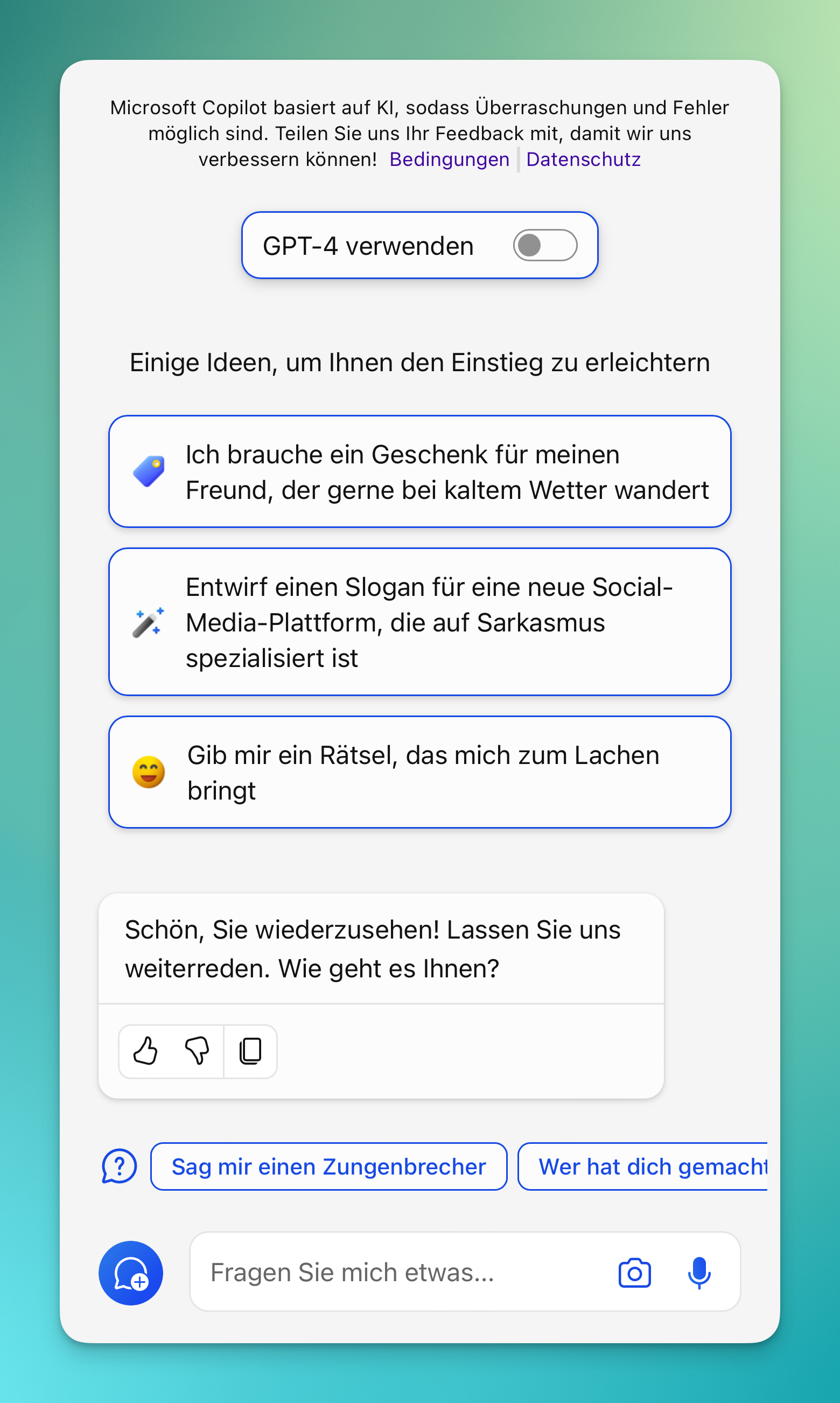 - Startet mit möglichen Beispielfragen.