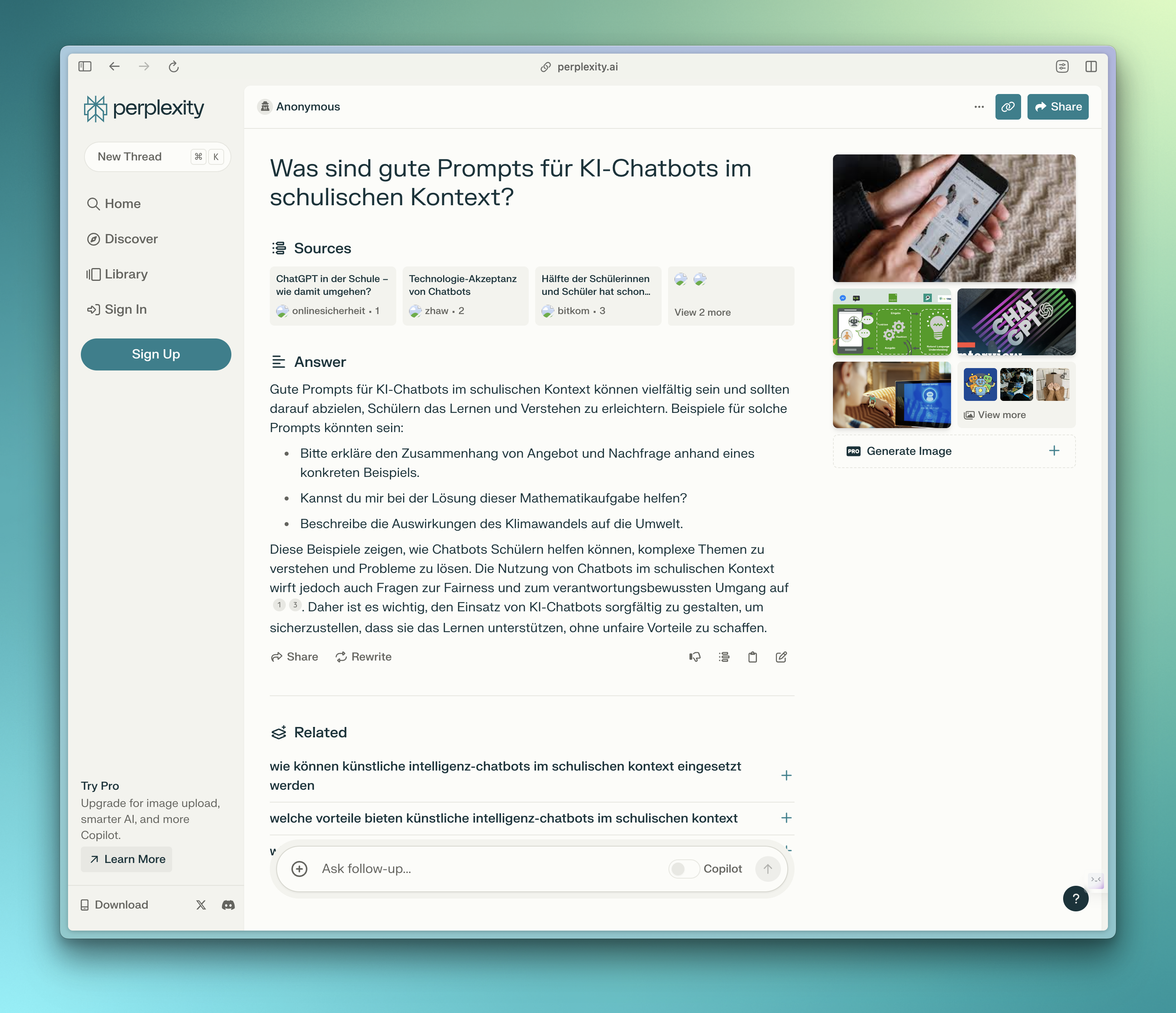 Perplexity AI ist kostenlos nutzbar, auch ohne die Erstellung eines Kontos. Es gibt aber auch eine kostenpflichtige Version für ca. 20.– Fr. pro Monat. Damit erhält man Zugriff auf Perplexity AI mit dem aktuellen GPT-4 und bis zu 300 Anfragen mit Copilot.