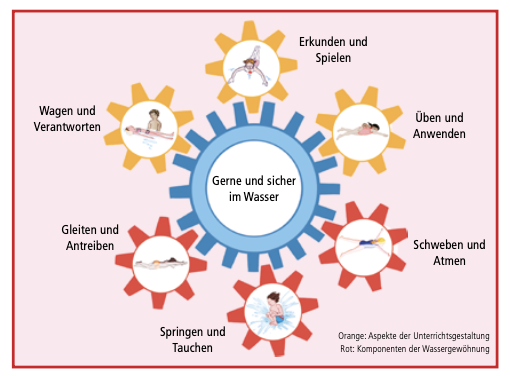 Das nachfolgende Modell zeigt Komponenten der Wassergewöhnung, die für die Schülerinnen und Schüler im frühen Schulalter im Zentrum des Unterrichts stehen, und weist auf bedeutende Aspekte der Unterrichtsgestaltung hin.