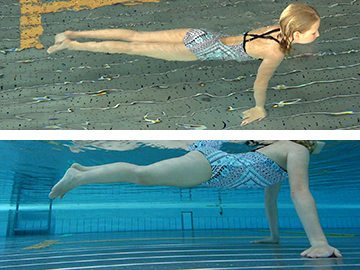 Übungsbeschrieb In Liegestützposition im knietiefen Wasser (Hubboden). Um sich besser in der waagrechten Lage halten zu können, sind die Finger beider auf dem Hubboden abgestützten Hände nach hinten (fusswärts) gerichtet. Fokus