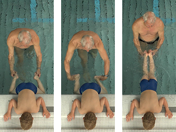 Übungsbeschrieb Halb auf dem Bassinrand liegend, die Beine im Wasser, Bauchnabel bündig zum Beckenrand, Arme bequem abgestützt.