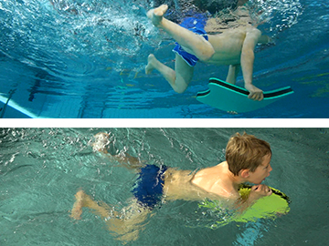 Übungsbeschrieb In Bauchlage das Schwimmbrett in verschiedenen Positionen haltend, mit Kikker-Beinantrieb vorwärts bewegen. Fokus