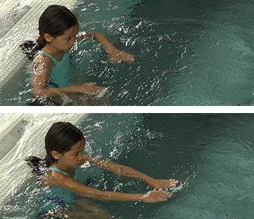 Übungsbeschrieb Im Wasser stehend, Rücken an der Bassinwand, Knie soweit gebeugt, bis das Wasser zum Kinn reicht. Die flachen Hände mit geschlossenen Fingern an der Wasseroberfläche kreisförmig von der Mitte nach aussen bewegen, wie wenn zwei Teller gleichzeitig gewaschen würden. Vorteil des Bassinrands: Die Arme können nicht zu weit nach hinten geführt werden. Fokus- Diese Übung lässt sich auch im Schwarm, ohne Beckenrand im Rücken, ausführen. In diesem Fall ist darauf zu achten, dass die Bewegungen nur so gross sind, dass die Hände bei Blick nach vorne jederzeit gesehen werden können. Verschwinden die Hände aus dem Blickfeld, sind sie zu weit hinten.