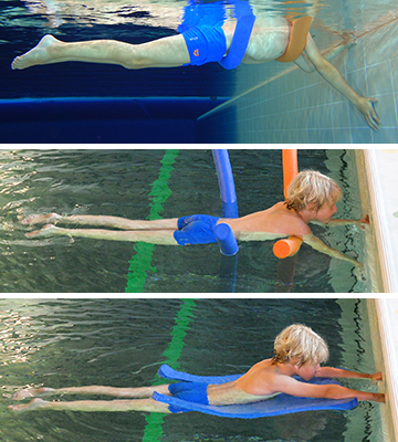 Übungsbeschrieb In flacher Wasserlage auf 1-2 Poolnudel(n) unter den Achseln positioniert oder auf einem Kikkerbrett liegend, mit gestreckten Armen an der Überlaufrinne festhalten. Um sich besser in der waagrechten Lage halten zu können, wird eine Hand unterhalb des Körpers an die Wand gedrückt. Die Finger zeigen nach unten (zum Boden). Fokus