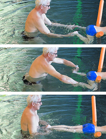 Übungsbeschrieb In flacher Wasserlage auf 1-2 Poolnudel(n) oder einem Kikkerbrett liegend mit gestreckten Armen an der Überlaufrinne festhalten. Um sich besser in der waagrechten Lage halten zu können, wird eine Hand unterhalb des Körpers an die Wand gedrückt, die Finger zeigen nach unten (zum Boden).