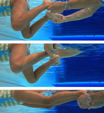 Übungsbeschrieb In Liegestützposition im schultertiefem Wasser auf der Treppe. Um sich besser in der waagrechten Lage halten zu können, sind die Finger beider auf der Treppe abgestützten Hände nach hinten (fusswärts) gerichtet.