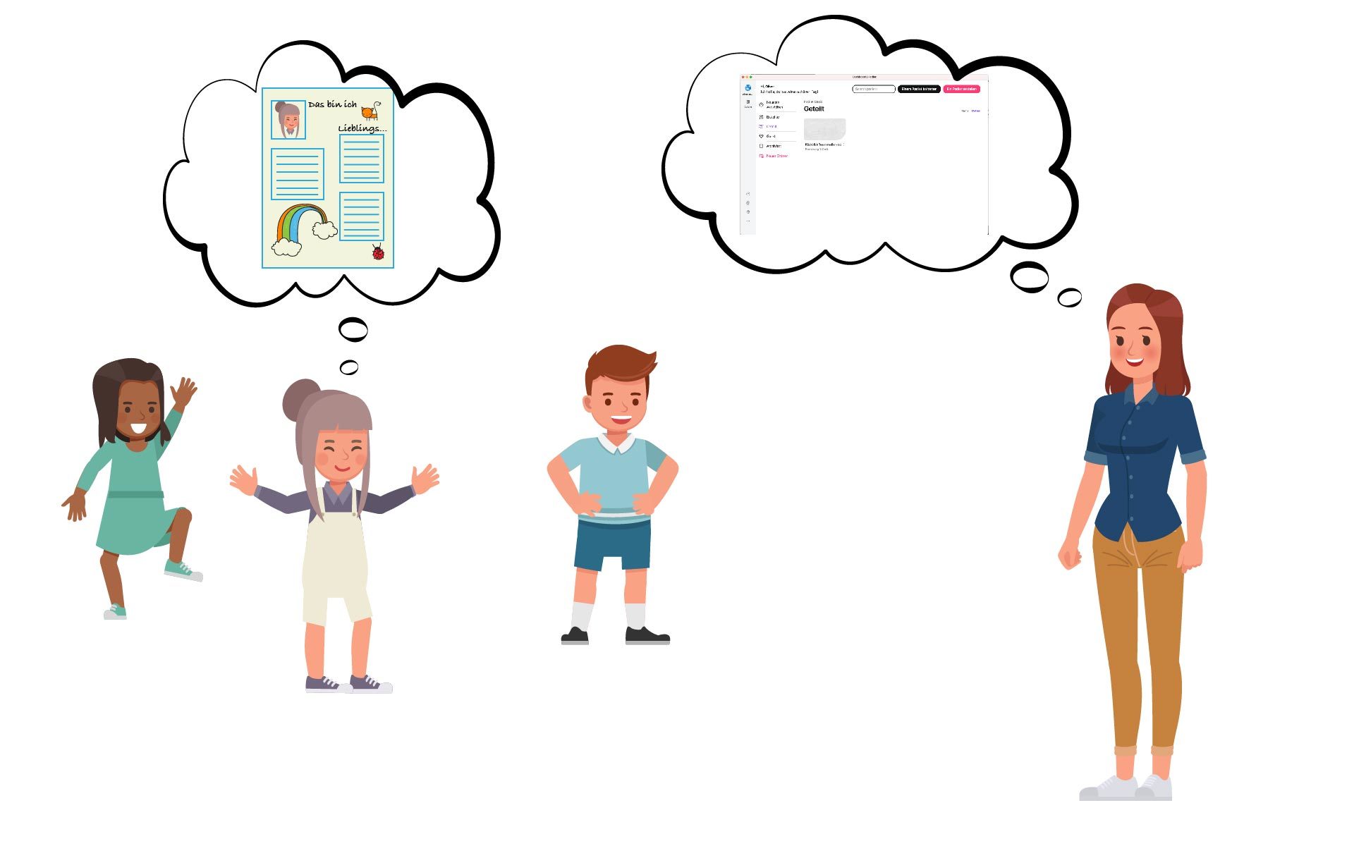 Bea verwendet im Unterricht eine virtuelle Pinnwand. Jedes Kind erhält ein eigenes, kostenloses Konto. Bea gibt den Kindern den Auftrag, einen Steckbrief auf der gemeinsamen Pinnwand anzulegen. Die Steckbriefe können später im Internet aufgerufen werden.