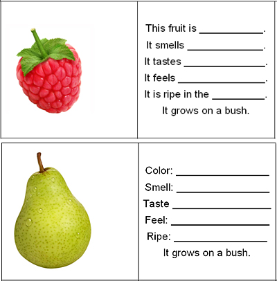 Then, as a writing activity, they practiced the worksheet you see here. This was a writing activity with a little bit of differentiation. The children had to fill in the cards for each fruit (in pairs) with enough information to be able to distinguish between the various types of fruit. Most children just had to fill in a few words. For a few others, they wrote the whole text. The following lesson they then played a reading memory. Some children transformed the words into sentences. Other children could just read the card aloud.