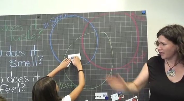 Teacher's thoughts: This lesson takes place in a 3rd grade class. This is the children's first year of English and they were working with First Choice, Seasons. I didn't know the class beforehand though the teacher did warn me that they were rambunctious. Prior to this pre-task, I did a warmup (the fruit salad game). The goal now was to elicit and teach vocabulary and to get the children thinking about talking with their senses - for instance that a teddy bear feels soft, but probably doesn't taste good! Or Swiss chocolate tastes and smells good. I explicitly introduced the Venn Diagram (to save time). If I could do it all over again: I would have had the children write the words on the board into the correct places on individual Venn diagrams (individually or in pairs) because you want to promote thought (e.g. that Teddy bears can also smell good!).