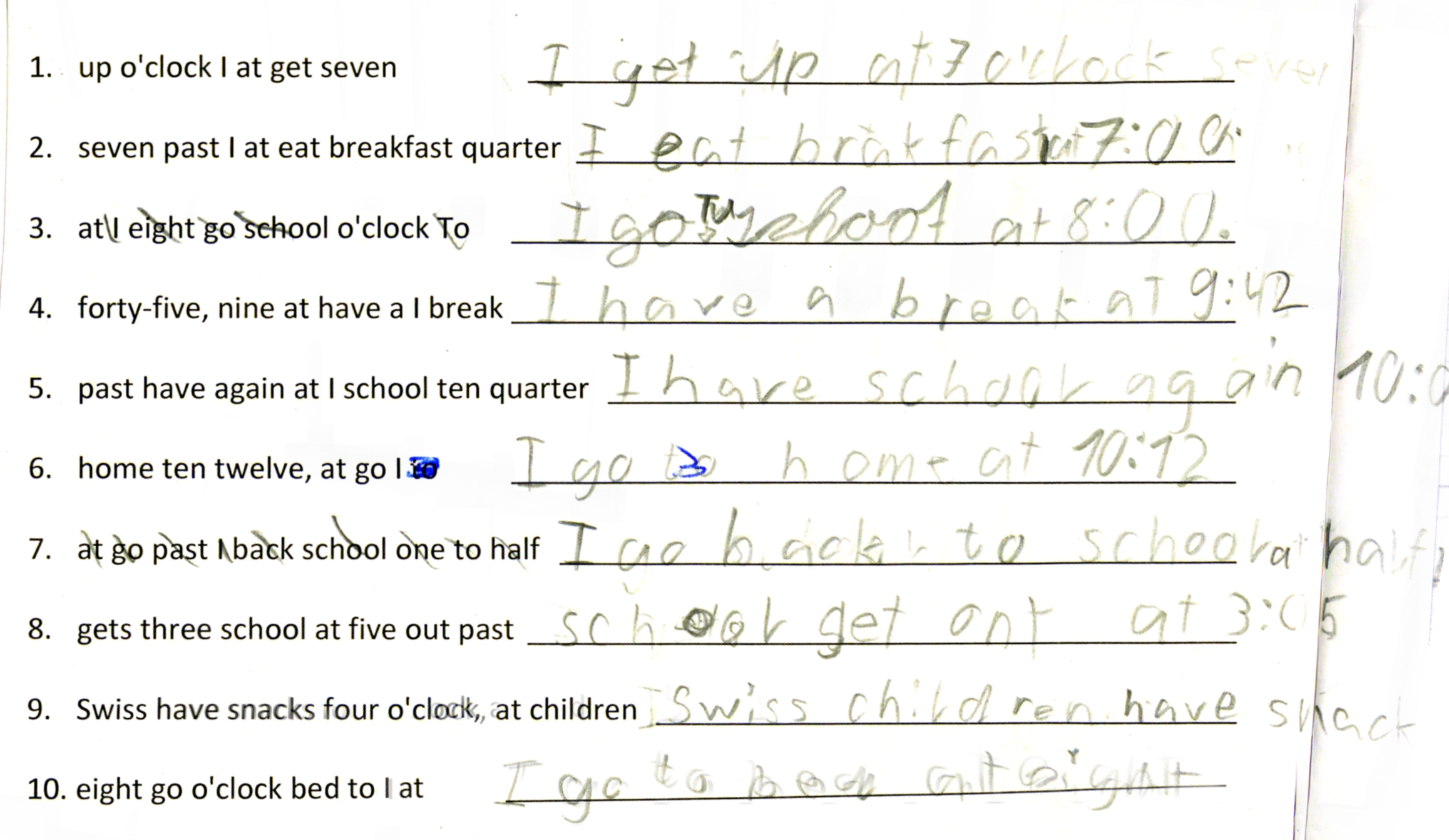 In this example, third graders had to unscramble the sentences in order to write about someone's day. After this, they had to write about their own day and write two truths and a lie. Discuss the purpose of this, if and how you would correct it, and different ways you can use the "two truths and a lie" activity.
