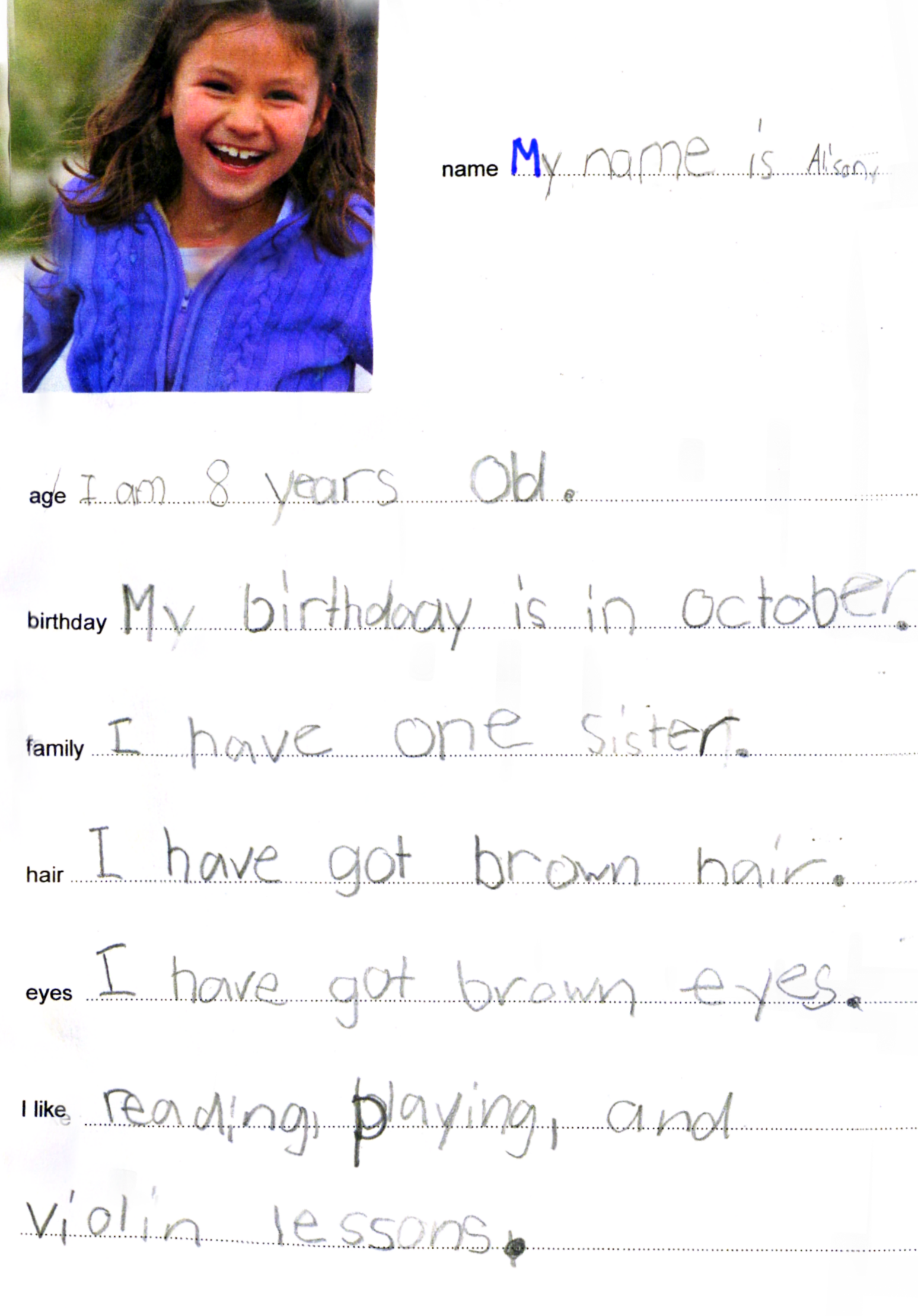 In this example, the writing here was used when English was taught in the second grade (now it is in the third). The learners put together a little book to send to a practicum teacher to introduce themselves before the student teacher came to their class. The kids had to write and re-write several times.