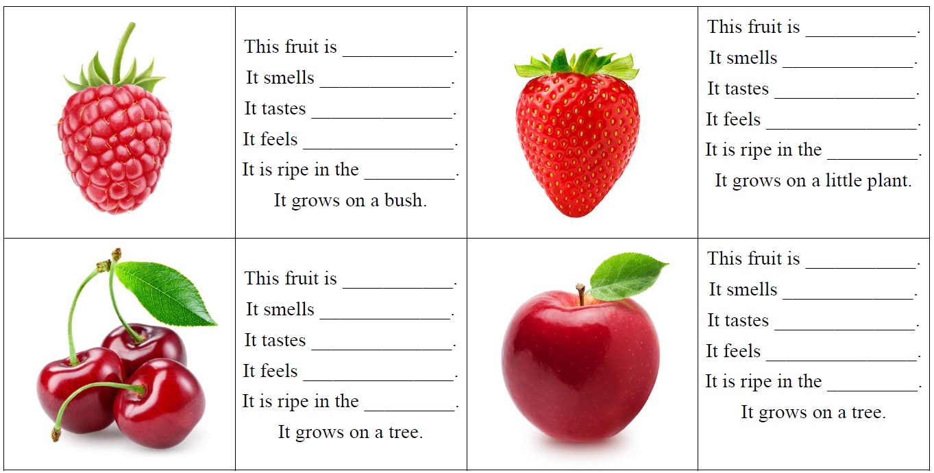 Learners should be asked to copy correctly but they should not be "penalized" for their spelling but rather given opportunities to re-write. In this example, learners complete the cards and then play memory in a way that can lead to communicative language such as "It's your turn" or "That's a match"! However, the focus here is on writing single words and the language is not so functional. How might you have the learners focus on writing "It tastes" or "This fruit is" instead of "sweet" or "red" so the focus should be more on the language structures that transfer to different contexts?