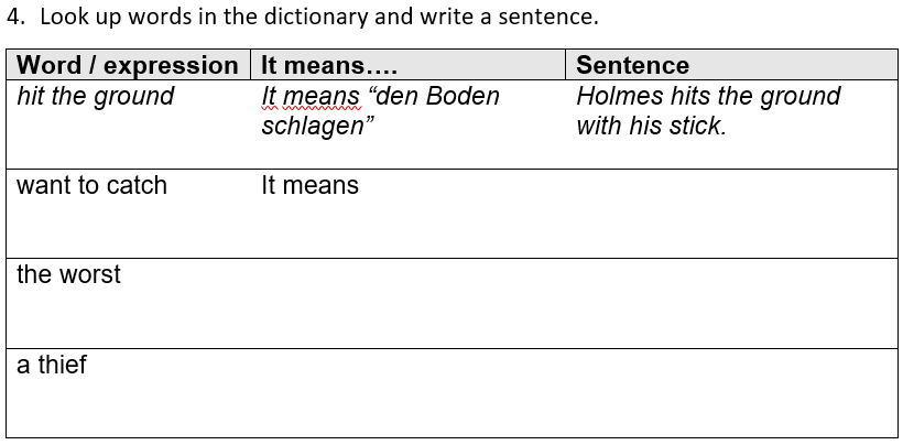 In this example, you see the work before the test. The teacher wanted the learners to use the dictionary and also to learn to use the expression "It means...". What you see here is the TEACHING exercise, but the TESTING was the exact same table to fill in.