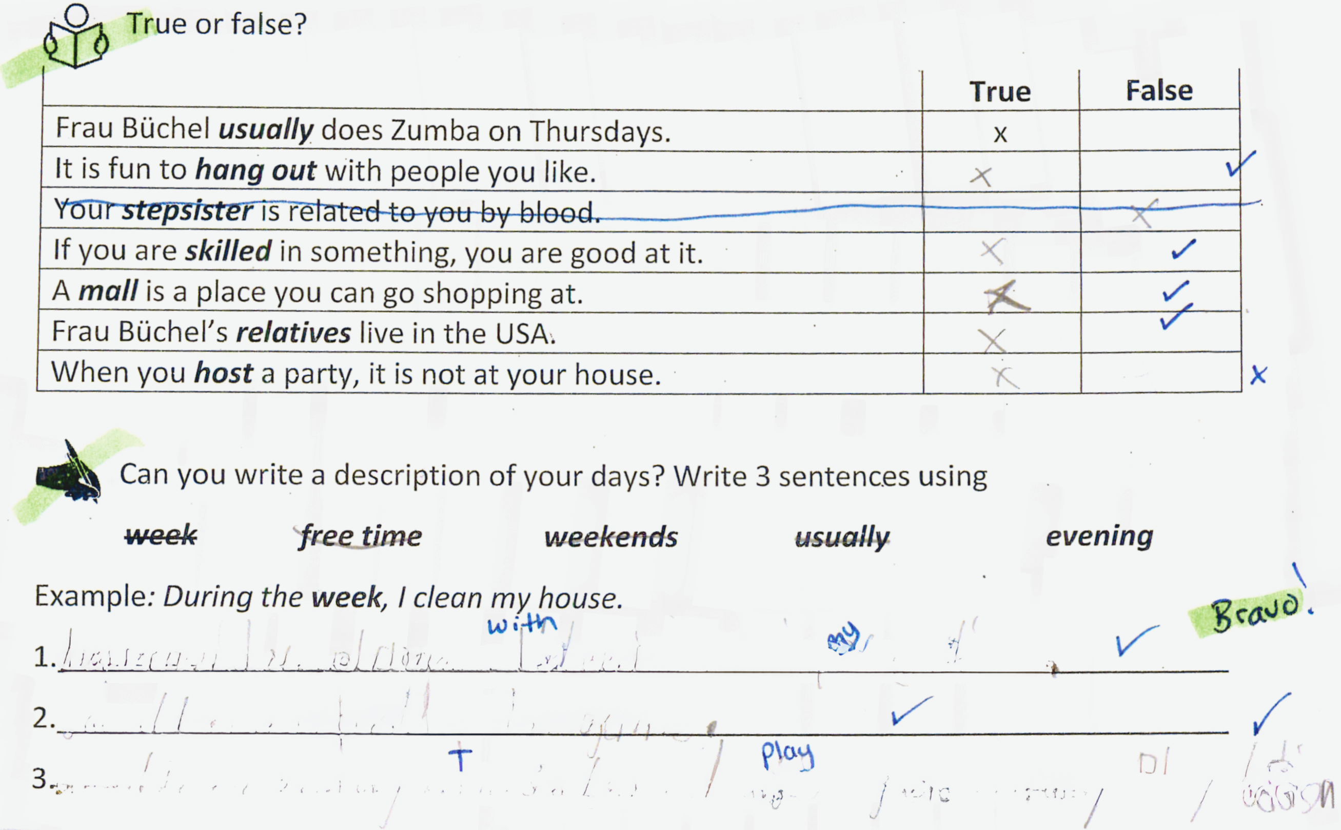 In this example, you see that the key vocabulary the learners had worked on in their books is tested through reading and writing skills. Every child (22) got the crossed out statement wrong, thus it was not included in the test. The teacher never used points, but made 3 groups - kids who more or less performed well, those who needed more work but could do it, and those who didn't try or got more or less everything wrong.