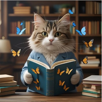 Canva: a cute teacher cat who is trying to make the textbook come alive
