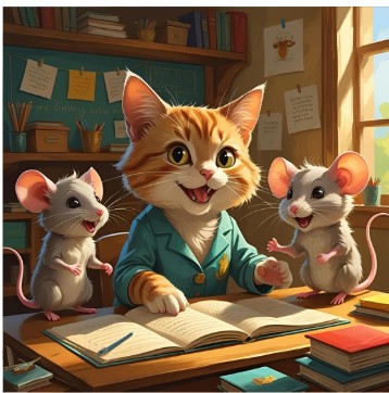 Canva: A cute cat teaching some mice who are totally excited about learning