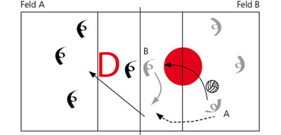 ![]() | BeschreibungZwei 4er-Teams stehen im Feld und spielen miteinander. Der über das Netz gespielte Ball wird gefangen und in die rote Zone geworfen. Ein Verteidiger von Team B nimmt den Ball ab und spielt ihn zu Spieler B, welcher ihn parallel zum Netz zu A zurück spielt. A spielt den Ball mit einem oberen Zuspiel zurück auf Feld A. Welches Team schafft 20 Netzüberquerungen? Erleichterungen: