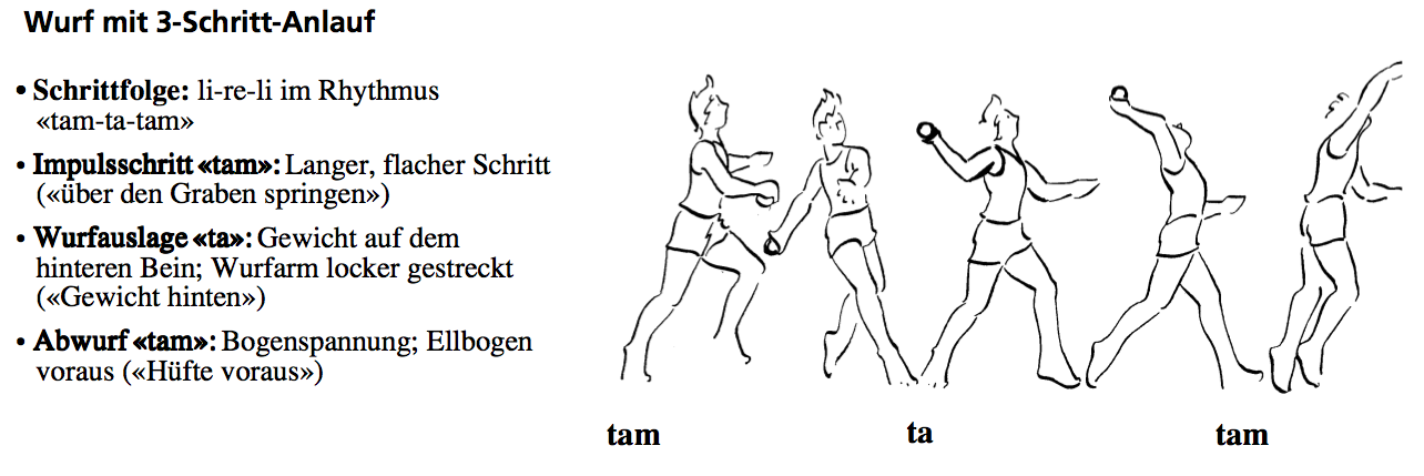 Werfen, Schleudern und Stossen sind natürliche Bewegungsformen. Aus diesen Grundbewegungen heraus entwickeln sich Spiele wie Handball, Basketball oder Frisbee und die leichtathletischen Disziplinen Speer-, Diskuswurf und Kugelstossen. (Baumberger, J./ Müller, U.: Lehrmittel Sporterziehung. Band 4, Broschüre 4, S. 27) |