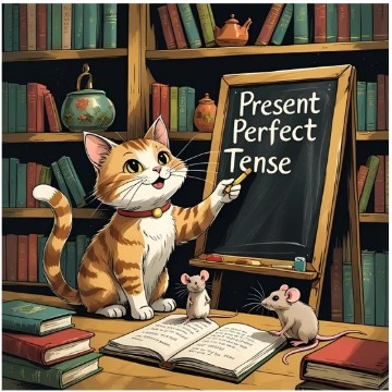 Canva: A cute cat teaching some mice the present perfect tense in English